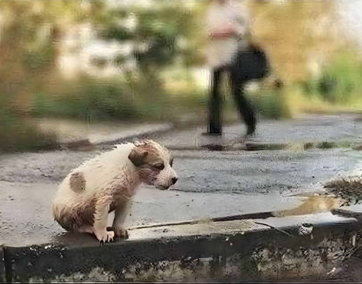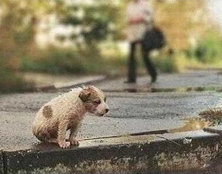 Na samym skraju chodnika leżał/siadał maleńki piesek — tak niewielki, że łatwo byłoby go przeoczyć. Był przemoczony, drżał z zimna i zdawał się być ogarnięty jednym uczuciem: opuszczenia. Nie miał czym uciec, nie miał jak się obronić, nie miał nikogo, kto by go obronił. Po prostu pozostawał tam, jak rzecz porzucona, jak ktoś, kto stał się niepotrzebny.