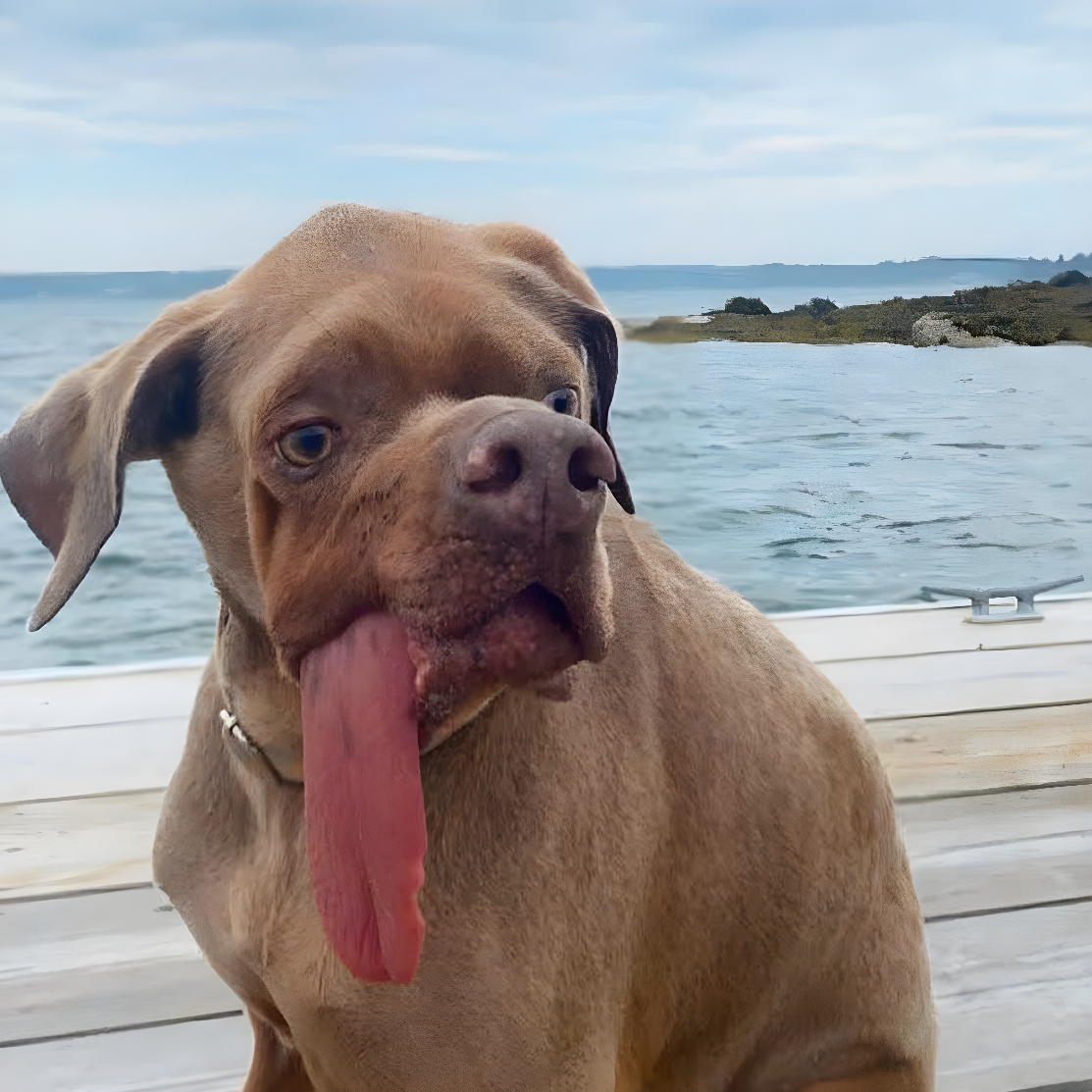 Znalazłam go przy morzu — tam, gdzie drewniany pomost wtórował kamiennemu brzegowi i skrzypiał, jakby zapominał, kto nad nim stoi. Leżał bokiem do wiatru, z głową lekko przechyloną; z pyska zwisał mu niespotykanie długi, malinowy język — tak długi, że można by było nim ostrożnie przykryć koniuszek rękawa. Sierść miała barwę przypieczonego chleba, czoło zmarszczone jak drożdżowe ciasto. Spojrzał na mnie tak, jakby zdziwił się, że kogoś w końcu spotkał.