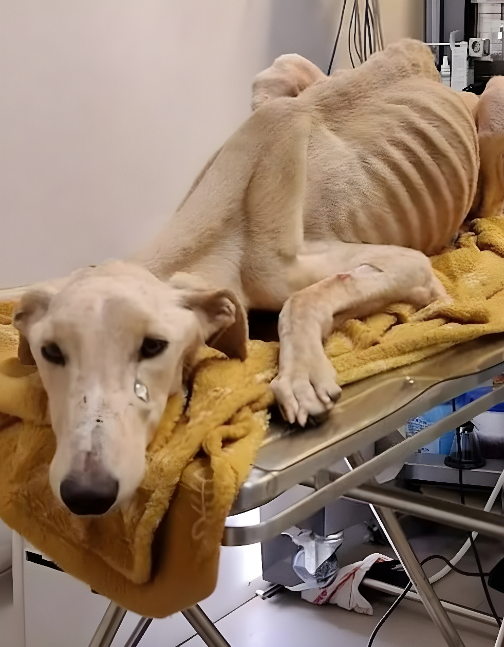 W mrocznym blasku prowizorycznej kliniki weterynaryjnej usytuowanej na deszczowych obrzeżach Manchesteru w Anglii, leżał szkieletowaty greyhound, który bezwładnie spoczywał na zżółkniętym ręczniku, ułożonym na stalowym stole. Jego żebra były wystające jak pręty zapomnianej klatki, a pierwotnie gładka sierść zamieniła się w posklejane plamy bladozłotego futra. To chłodne październikowe popołudnie w 2023 roku Clara Henshaw, lokalna miłośniczka zwierząt, napotkała go podczas wieczornego joggingu w opuszczonym terenie przemysłowym w pobliżu Salford Quays. To, co zobaczyła, zatrzymało ją na miejscu: pies tak wychudzony, że jego biodra wystawały jak ostre noże, a oczy były zapadłe w otwartych oczodołach, a na policzku błyszczała jedna łza, jakby opłakiwała własne istnienie. To był Walentyn, racingowy greyhound, porzucony po latach udręki na torze, pozostawiony w świecie, który uznał go za nieprzydatnego, gdy jego prędkość zaczęła słabnąć. Clara nie zdawała sobie sprawy, że to serce łamiące odkrycie uruchomi ciąg niezwykłych wydarzeń, snując opowieść o przetrwaniu, skrytych tajemnicach oraz niewiarygodnych urodzinach, które rozprzestrzenią się po mediach społecznościowych, docierając do serc tysięcy ludzi na całym świecie.