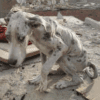 Znaleziono go niemal przypadkiem. Stał, chwiejąc się, w kącie podwórza. Nie wyglądał już jak pies — bardziej jak cień. Sierść wisiała strzępami, spod niej wystawały żebra, a stawy wydawały się zbyt duże dla tak wychudzonego ciała. Głowa zwisała ciężko, jakby życie samo przygniatało go kamieniem. Ledwo trzymał się na łapach, spojrzenie miał opuszczone, ale w oczach wciąż błyszczała iskra — słaba, lecz niepokonana.